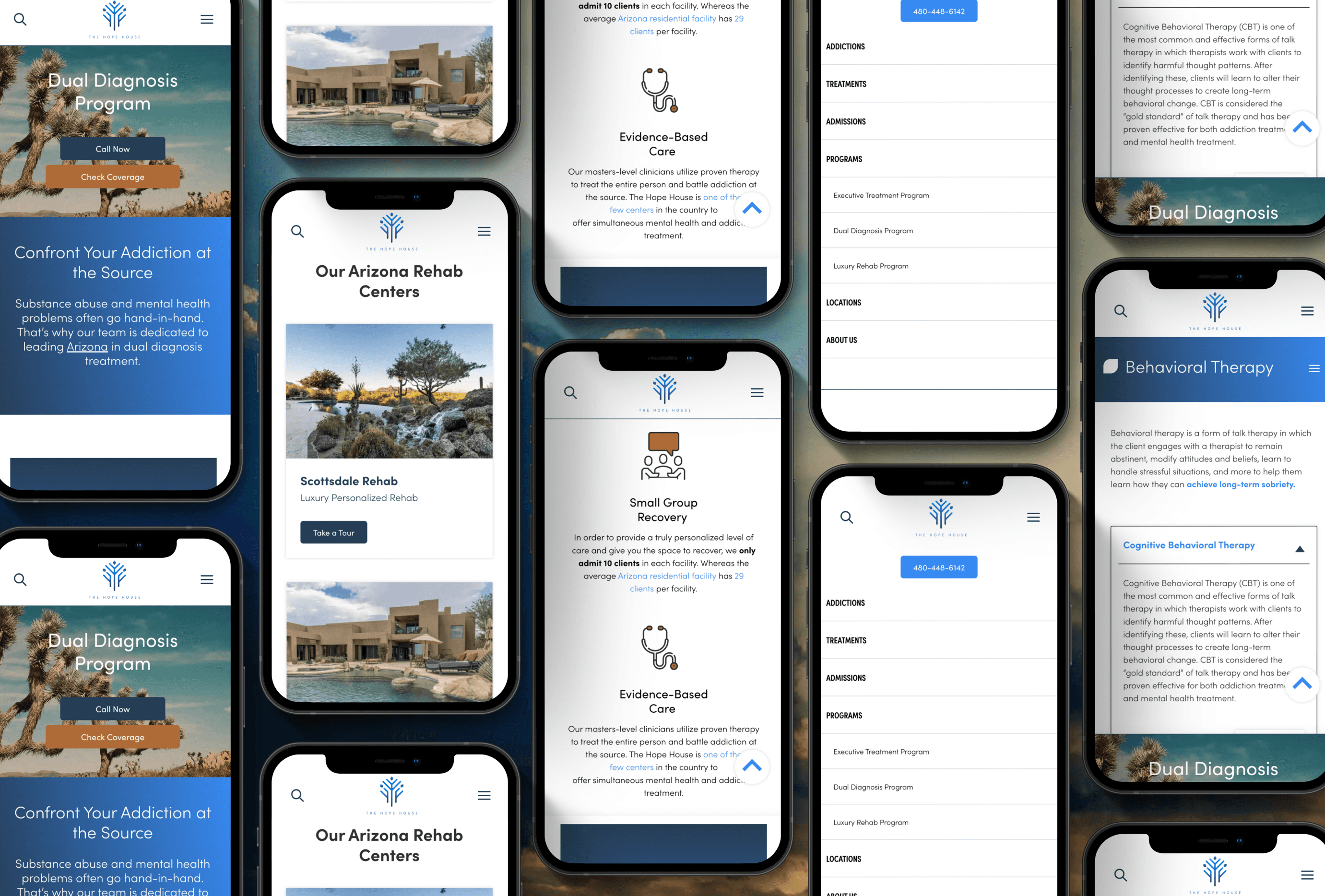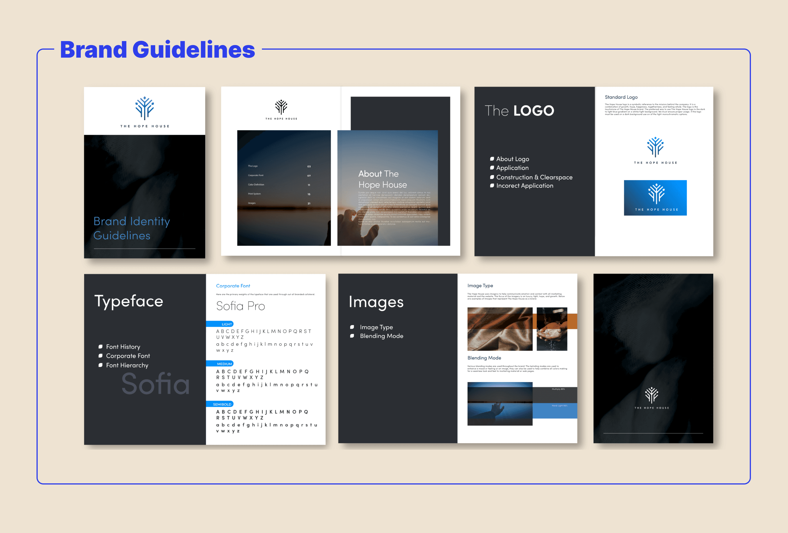 Conducted extensive research to understand the emotional landscape of families affected by addiction. Developed moodboards to explore visual themes and crafted a logo that symbolized hope and support. The logo is the touchstone of The Hope House brand. It is a combination of growth, hope, happiness, togetherness, and feeling whole. This design was inspired by the shape of a tree and leaves as well as the shape of a person reaching out and upward.