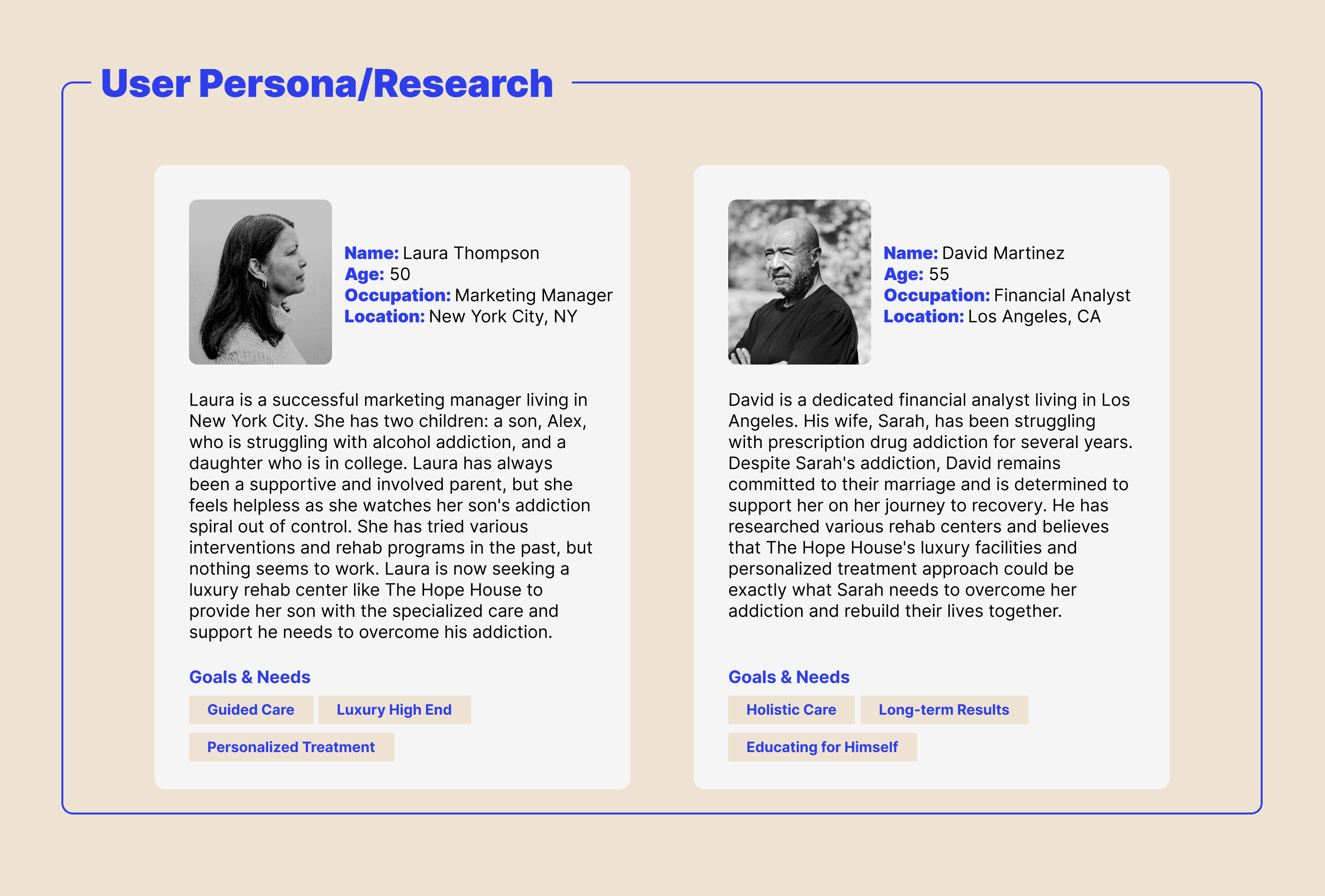 Developed detailed user personas representing the needs, goals, and pain points of our target audience. Used these personas to inform design decisions throughout the project.